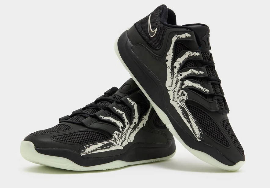 在上个月火箭队的季前赛定妆照中,Kevin Durant也是终于身着火箭球衣亮相,不过让各位鞋迷们感兴趣的更多来自于这位球星脚下的全新配色Nike KD 18;毫无疑问,鞋面上辨识度极高的“骨感”白色手臂,无疑不让人不往Nike KD 18「Halloween」这个配色上面去想。