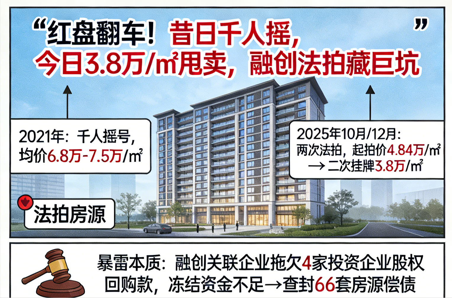 谁能想到?上海浦东唐镇融创未来金融城,这个2021年需“千人摇号”、均价6.8万-7.5万/㎡的顶流红盘,竟在2025年10月、12月两次登上法拍台,起拍价直降至4.84万/㎡,二次挂牌再打八折,仅3.8万/㎡!