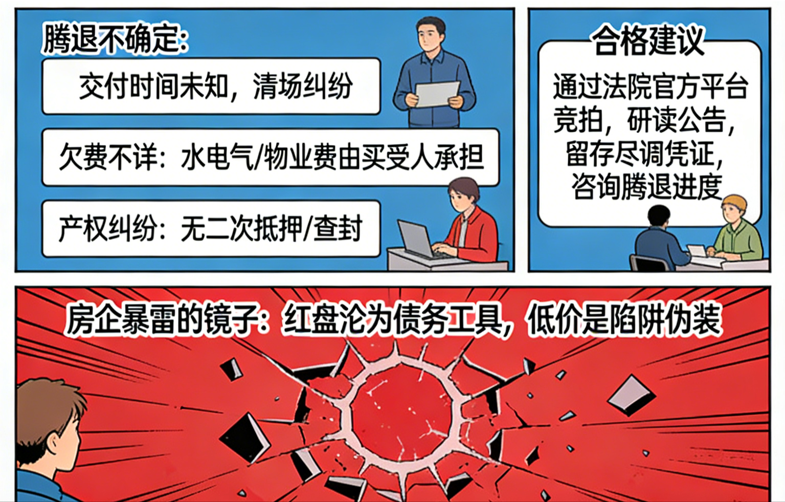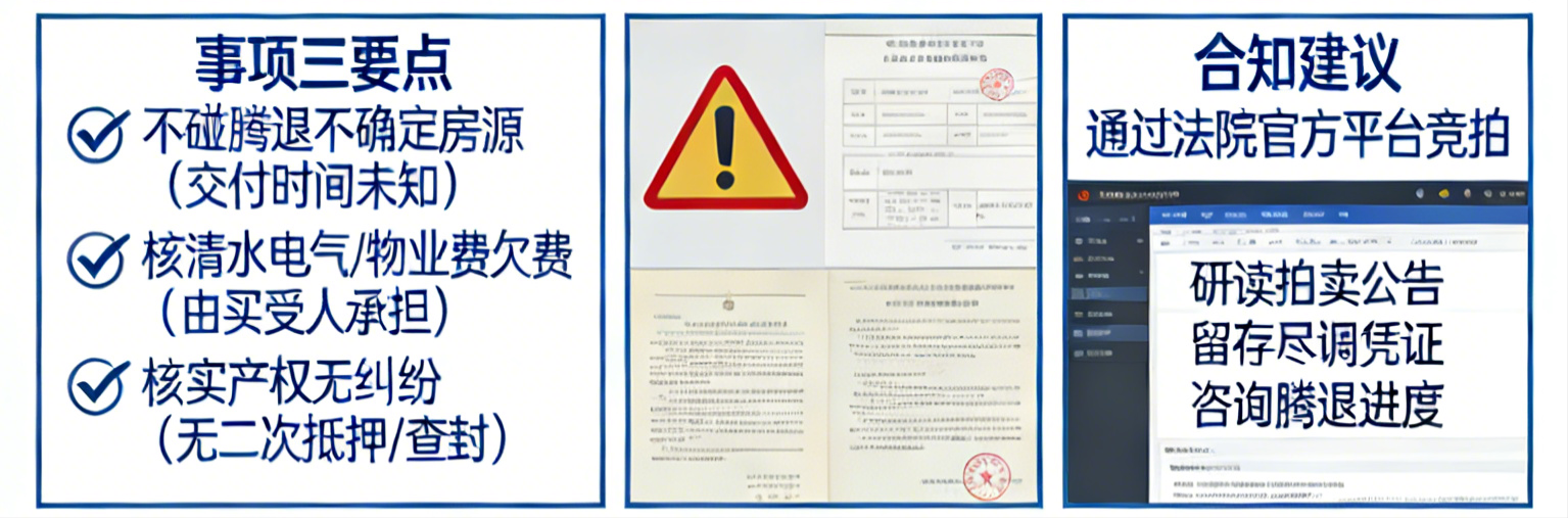 注意事项:一是坚决不碰“腾退不确定”的房源,哪怕是全新房,拍卖公告明确标注交付时间未知,大概率陷入漫长清场纠纷,买了也住不进;