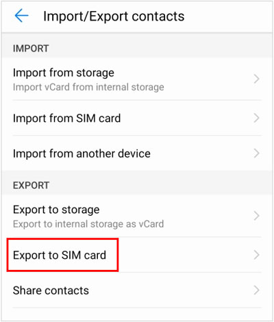 步骤 5. 导入完成后,在Android设备上点击“导出联系人”>“导出到 SIM 卡”。然后 iPhone 联系人将被复制到 SIM 卡。