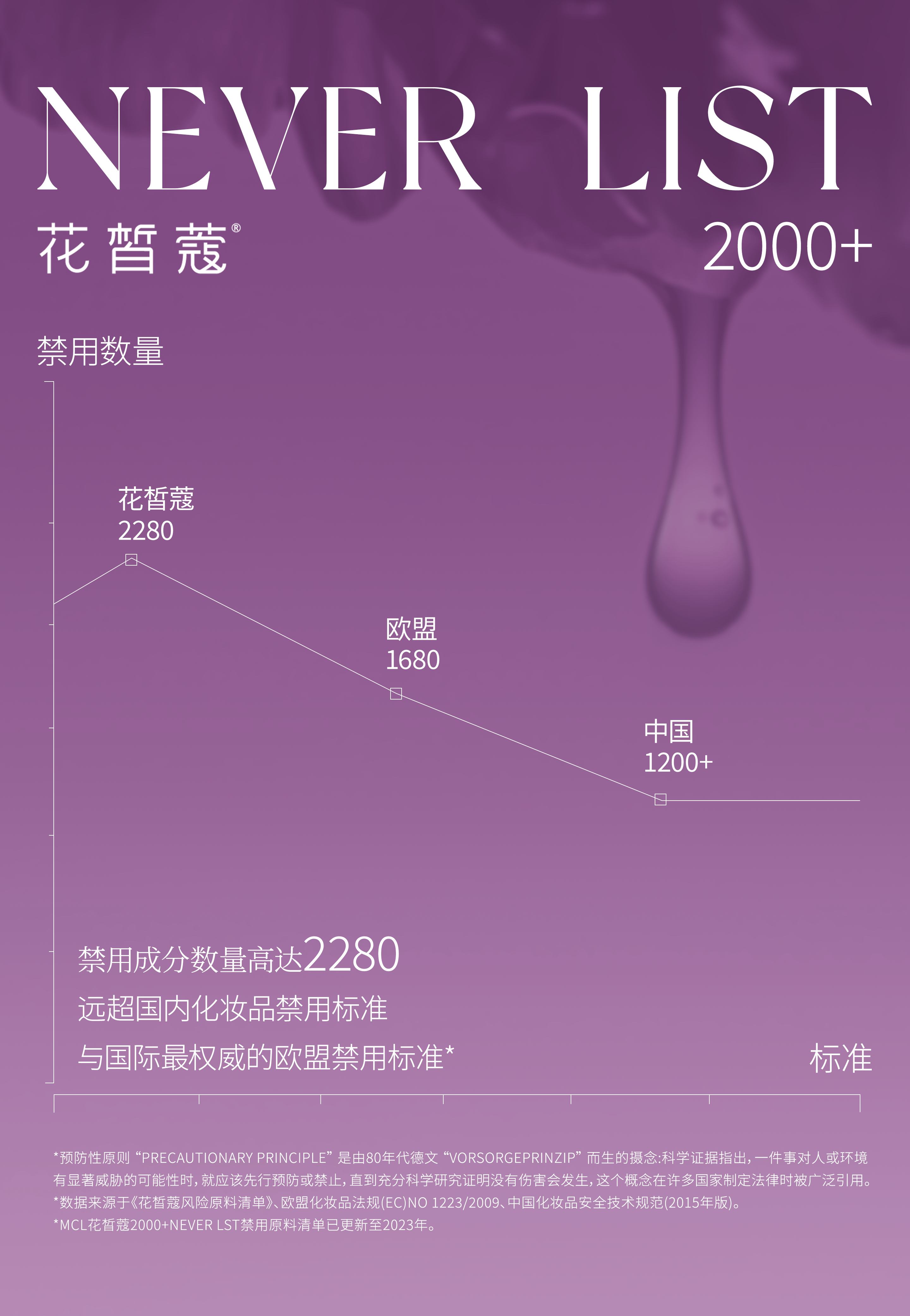 创建的2000+NEVER LIST禁用原料清单更是历经5年打磨,已动态更新至2280种风险成分,严格禁用可能“致癌致畸、引发激素紊乱、导致精神上瘾、刺激皮肤、伤害生命”的六大类风险成分,远超国内化妆品禁用标准(1200+)和国际欧盟禁用标准(1600+)。