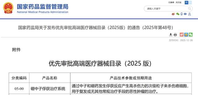 2025年12月26日,国家药监局将硼中子俘获治疗系统纳入优先审批范围。这一重大政策为这种创新肿瘤治疗技术在中国的发展按下了“加速键”。