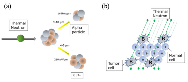 硼中子俘获治疗(BNCT)是一种放射治疗技术。通过将含硼药物注射到癌症部位,当药物在肿瘤部位富集后,再用中子束照射病灶。硼与中子发生核反应释放的高能粒子(α射线和7Li核)能精准摧毁癌细胞。这种射线在体内仅能传播极短距离(约单个细胞的直径),因此可精准破坏摄取硼药的细胞。治疗成功的关键在于,要让含硼药物对癌细胞具有“吸引力”,使其能被大量摄取。
