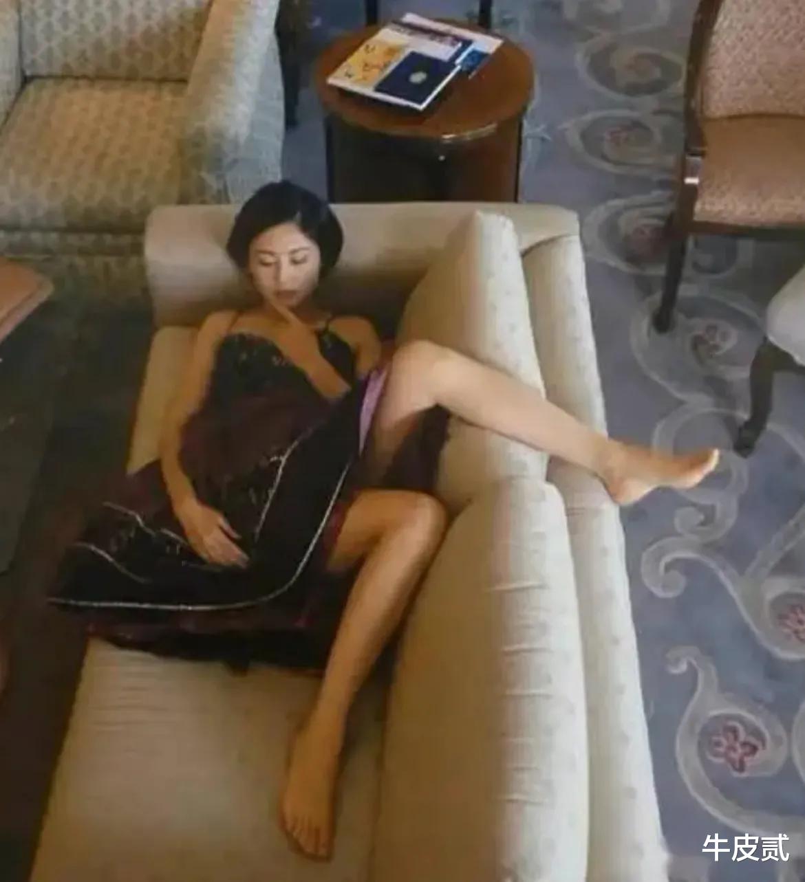 陈红头发拢着,枕在沙发边上,腿随意搭在靠枕上,闭着眼睛,手指轻轻抵在嘴唇边,整个画面特别安静,又带着那么点撩人的味道。