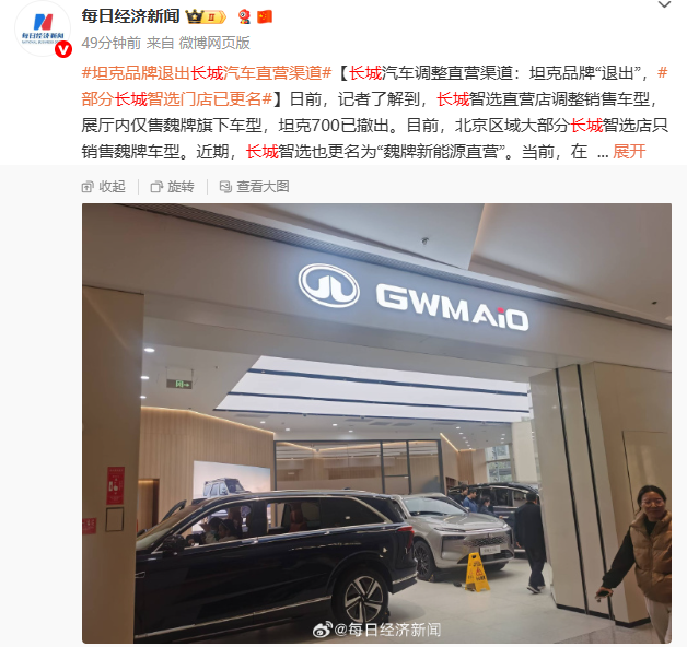 坦克品牌撤出,长城汽车直营门店更名“魏牌新能源直营”