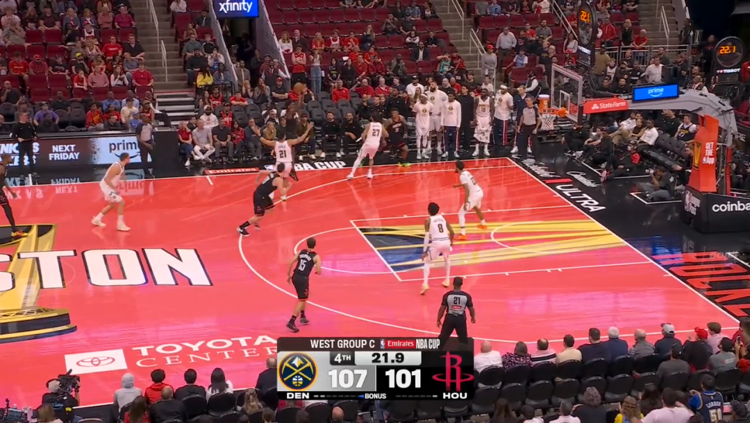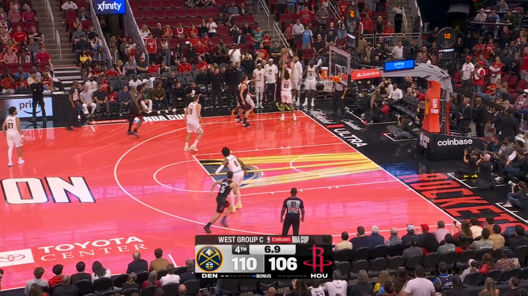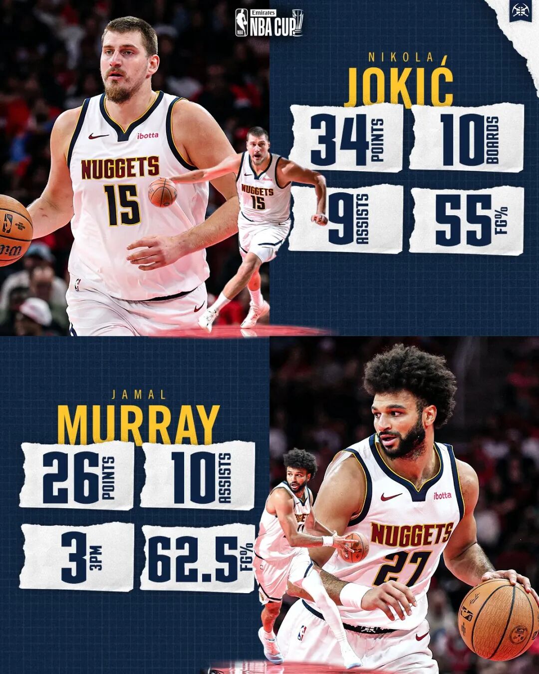这场比赛的重要性不言而喻:NBA杯层面,赛前掘金1胜1负净胜分+23分,火箭1胜1负净胜分+13分,两队分别排在西部C组前二,都要争取一个出线名额。