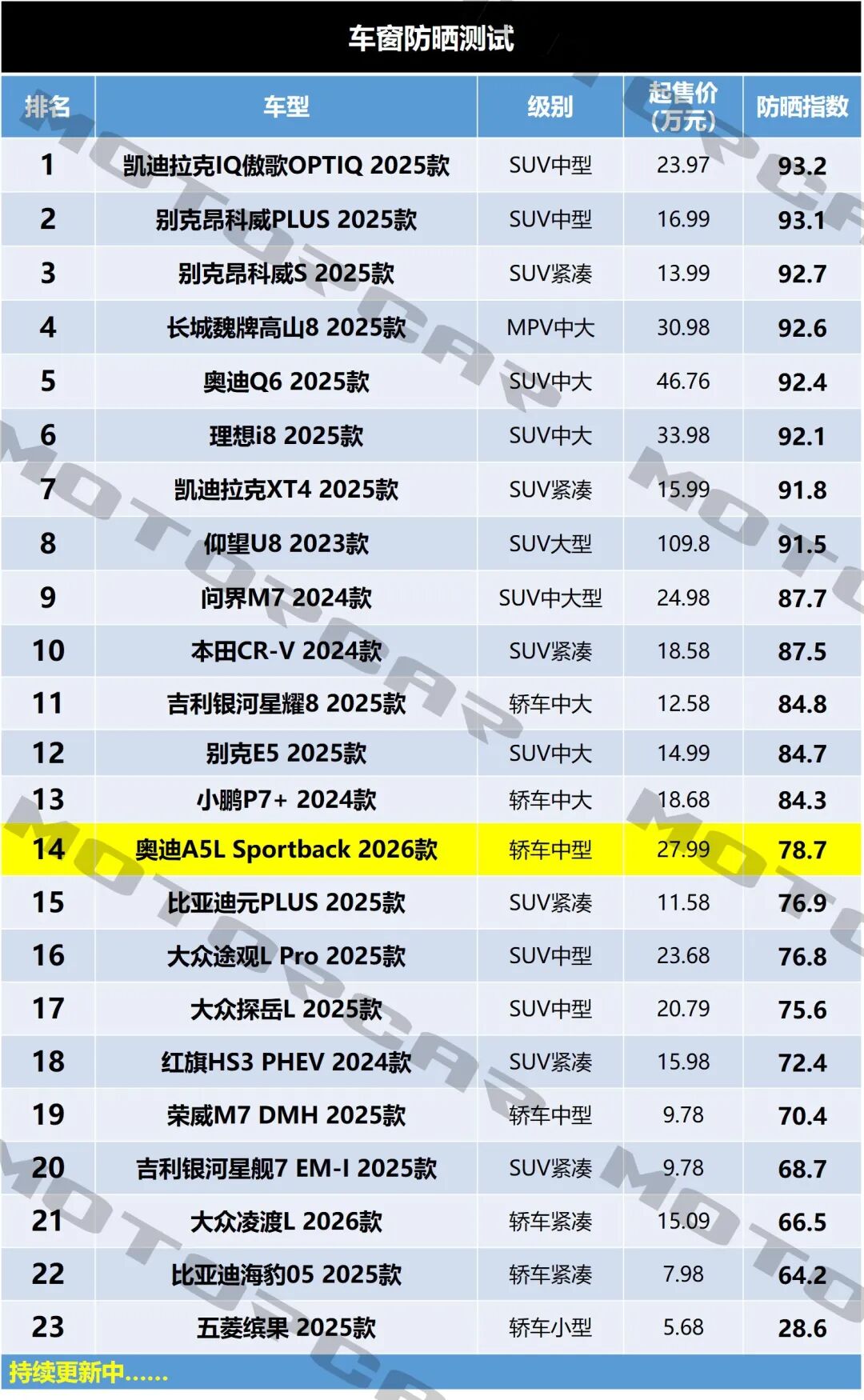 这套测试模型以及评价标准,就是用所有测得的红外线阻隔率数据加上所有的紫外线阻隔率数据,除以2,再除以测试的玻璃数量,就能得出全车防晒指数。满分100分,分数越高,防晒指数就越强。至于透光率并不在评价体系的考量范围之类,因为这个是有专门的国家强制标准来限制的,大家不用担心前挡玻璃透光率过低。