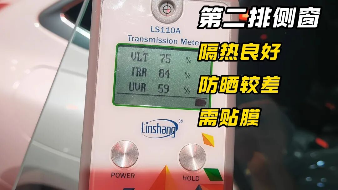 奥迪A5L Sportback第二排侧窗还好……这里说的还好不是说数据好,而是因为第二排侧窗没有透光率的强制国标限制,所以贴膜想怎么贴就怎么贴——就挑那种红外阻隔率和紫外阻隔率最大的膜就可以了。透光率(VLT)75%,说明这块玻璃不是隐私玻璃。84%的红外阻隔率(IRR)还算过得去,59%的紫外阻隔率(UVR)就太敷衍了。毫不客气地讲,奥迪在这块玻璃上偷工减料了。