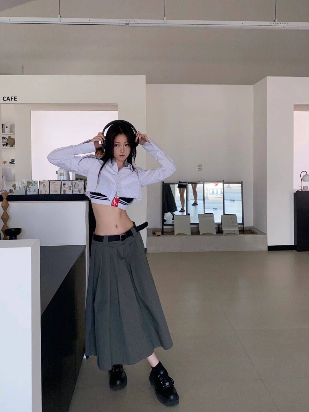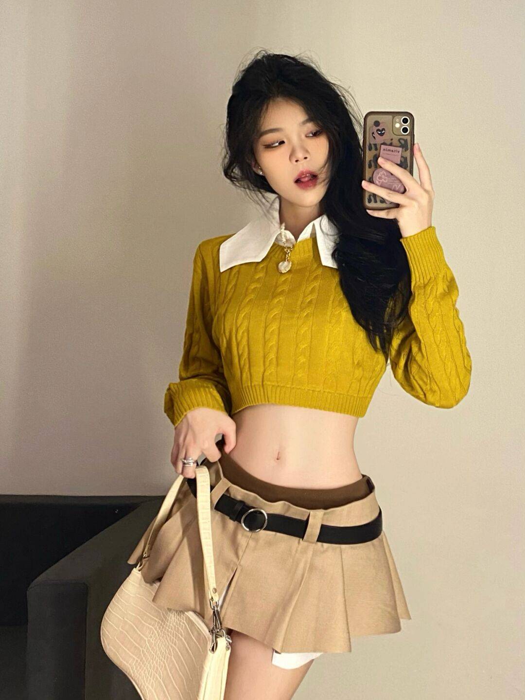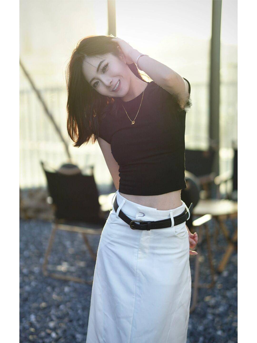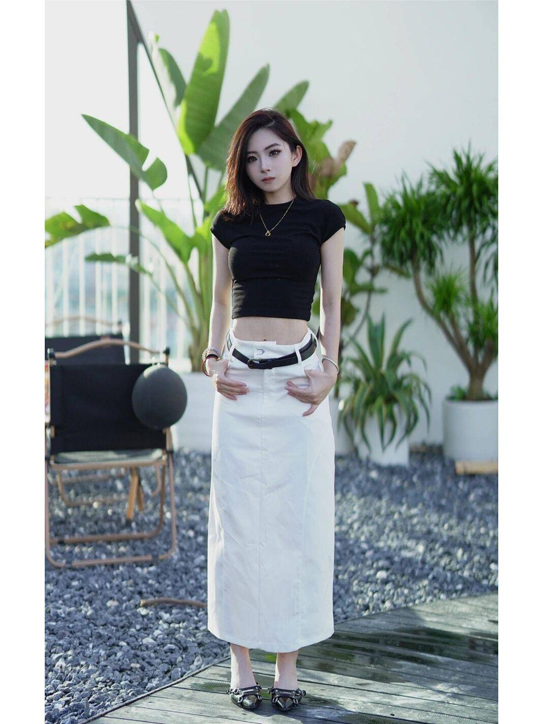 穿搭低腰裙的时候,尽量选择一些短款修身的上衣,或者是有分叉设计的上衣,进一步强调突出我们腰部的线条感,同时整体造型也多了几分帅气与洒脱,比年轻女孩们来说,这样的搭配是非常个性前卫,潮流感满满的。