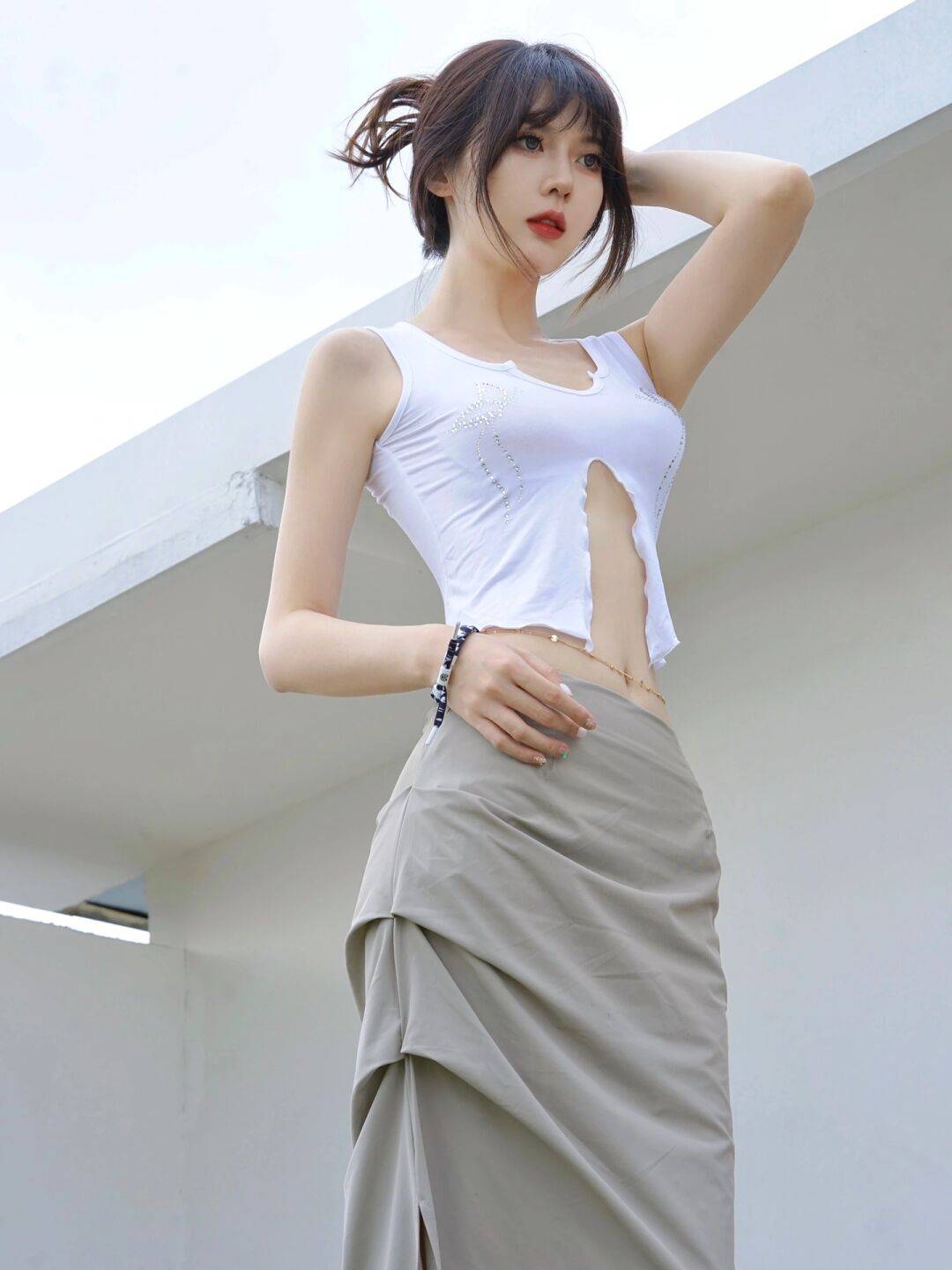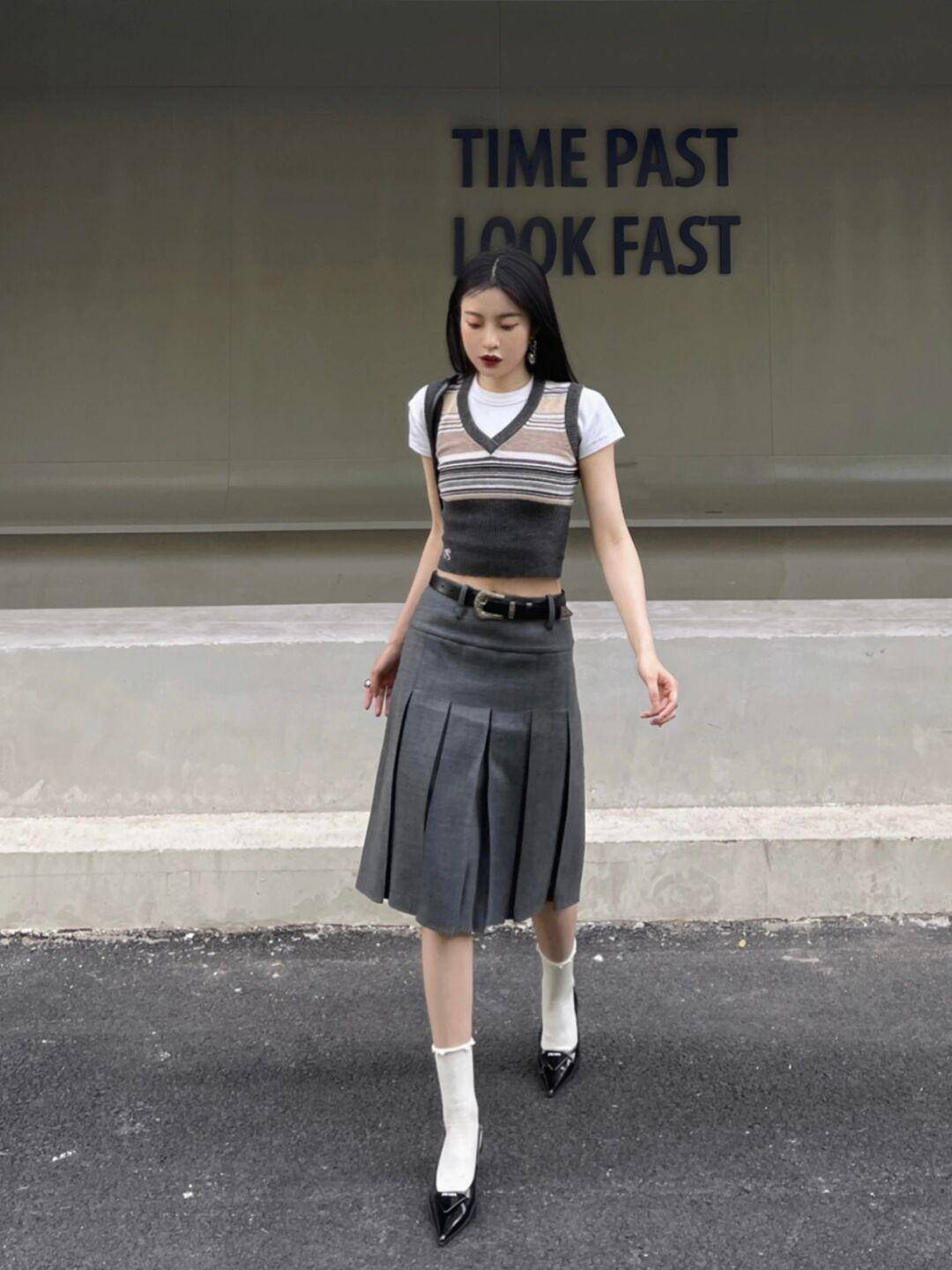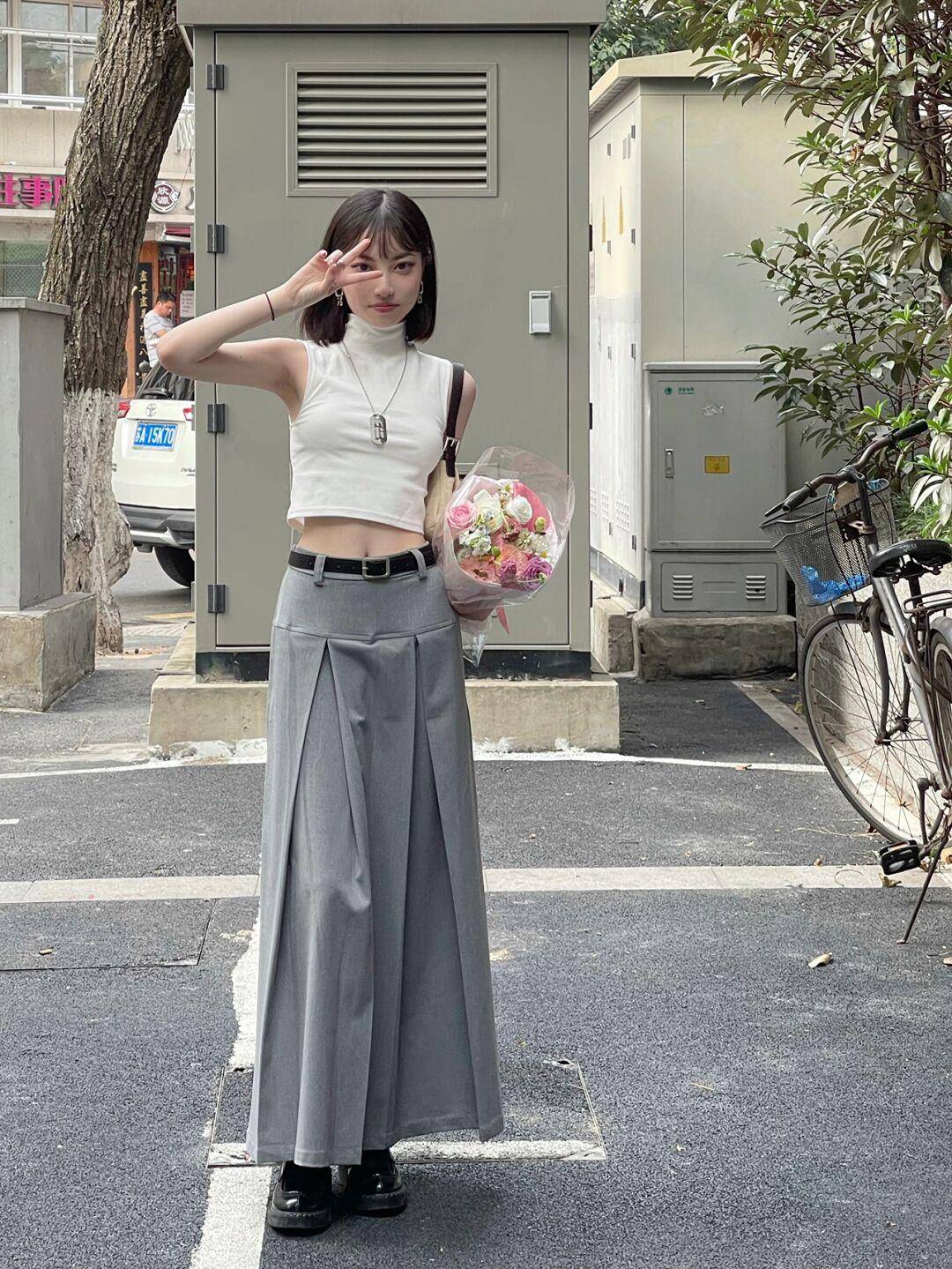 即使是想要降低造型露肤度,选择叠穿,长裙这样的组合,也需要记住,不过腰,就拿下面的穿搭来说,白T恤配修身的针织马甲,简约文艺,但长度依然把控得很高,适当的露出我们腰部的肌肤,搭配灰色的低腰半身裙,既简约又时髦,是日常穿出门也不违和的一套搭配了。