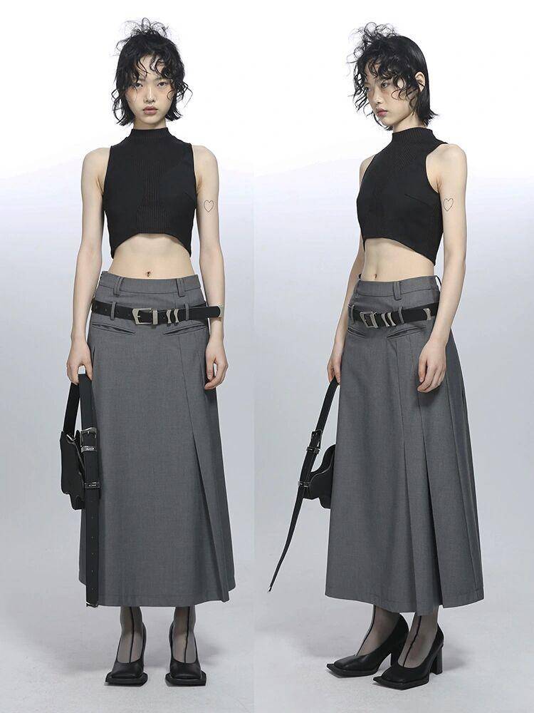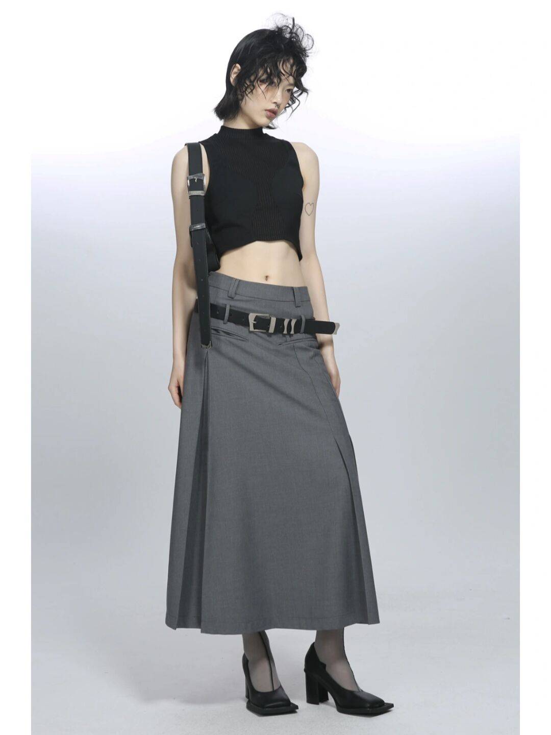 不得不说,腰带确实是个好东西,看似不起眼,却总能让我们的穿搭更出彩,有的人觉得低腰裙的腰线还不够低,想要更加个性时髦一些,就会选择搭配腰带,并且腰带比裙子正常的腰线更低,这样可以起到强调的效果,搭配短款的黑色背心,高冷帅气,时髦精致又高调。