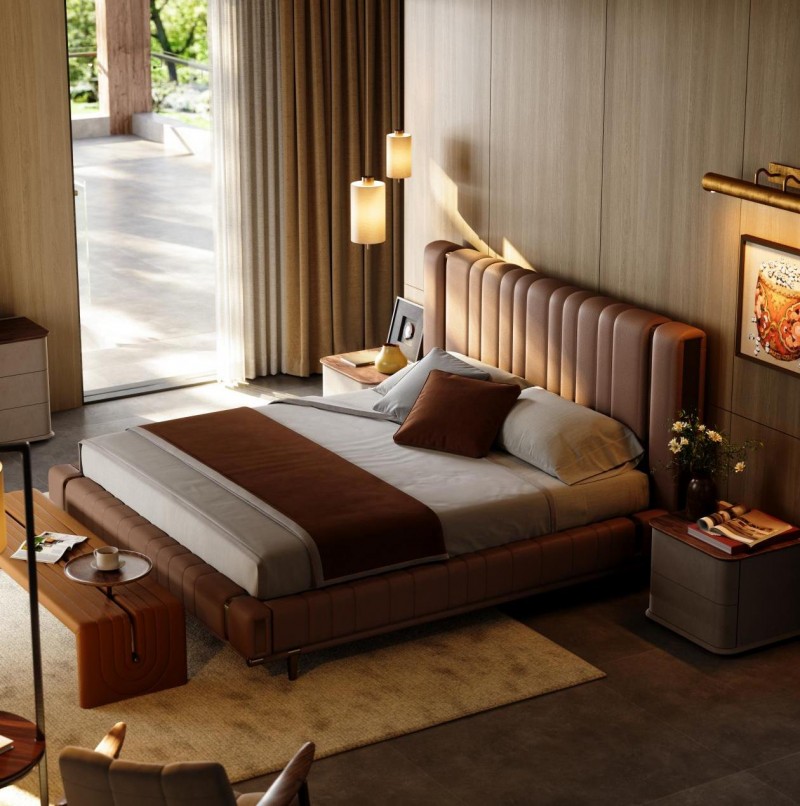 它的美学核心在于“留白”。没有冗余的装饰,仅凭流畅的线条勾勒轮廓,落地式床身与加宽加厚的床沿,便营造出昆仑山峦般的稳重感。而在极简的表象之下,是多元材质的精致博弈——柔软真皮的包裹带来温度,两侧内嵌的实木元素则为空间注入自然的呼吸感。