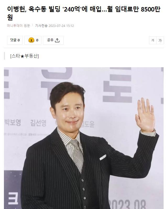 多家韩国媒体报道称,知名演员李秉宪,购买了价值240亿韩元的建筑物,每月租金收入八千万。