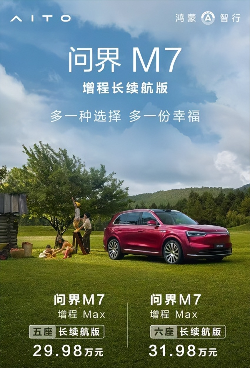 2026年1月13日,全新问界M7增程长续航版正式开启大定,售价29.98万元起,新版本CLTC综合续航达到1690km,CLTC纯电续航达到327km。即刻下定,可享至高60,000元购车权益。全新问界M7增程长续航版的加入,不仅让产品序列更丰富,更满足了用户的多元化需求,使全新问界M7“30万级价值之选”的含金量得到进一步提升。