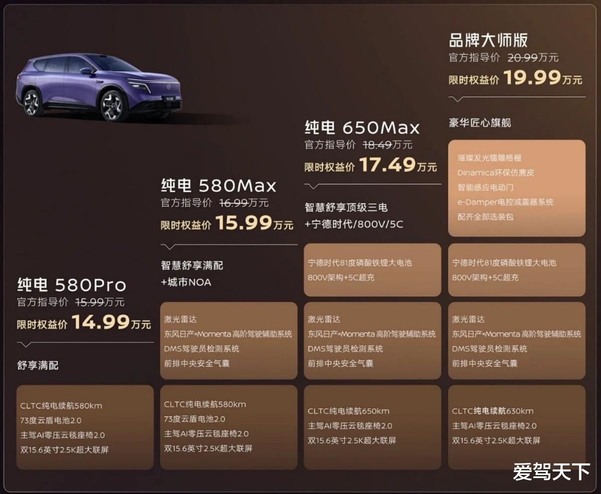 纯电580 Max,官方指导价16.99万元,限时权益价15.99万元。价格比纯电入门版贵一万元,升级了辅助驾驶,整体配置与增程150 Max几乎一致。