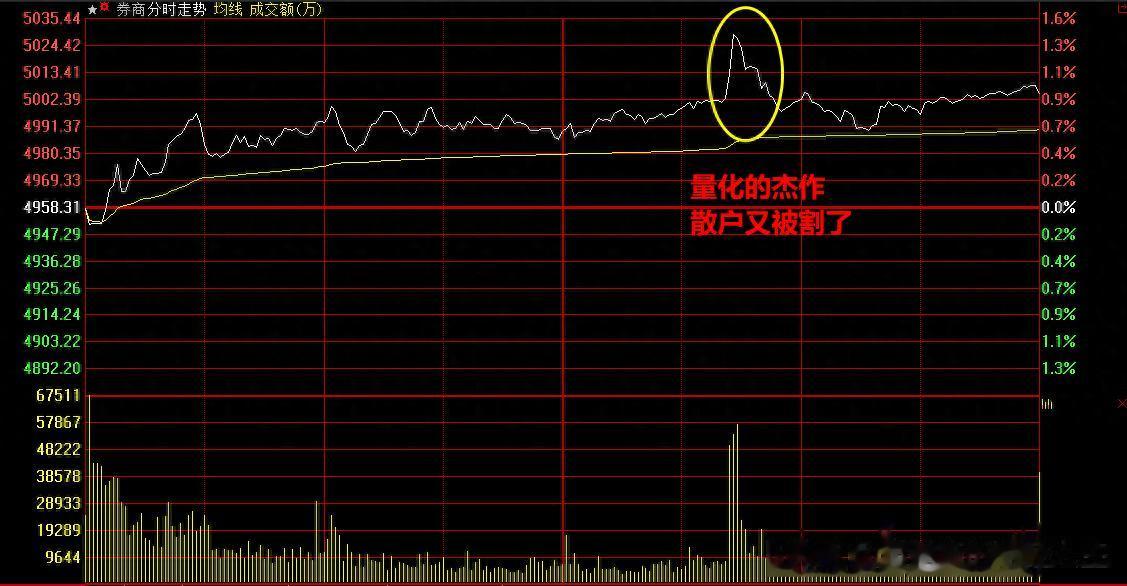 期间,券商也来了一波脉冲!3分钟上冲,走势相当“丝滑”,标准的“三分钟热度”,这种走势我已经反反复复说了无数次,不能再上当了,背后是量化在“割韭菜”呢!如果没有券商的这波异动,指数或许不至于转头向下。哎,量化!害人不浅!