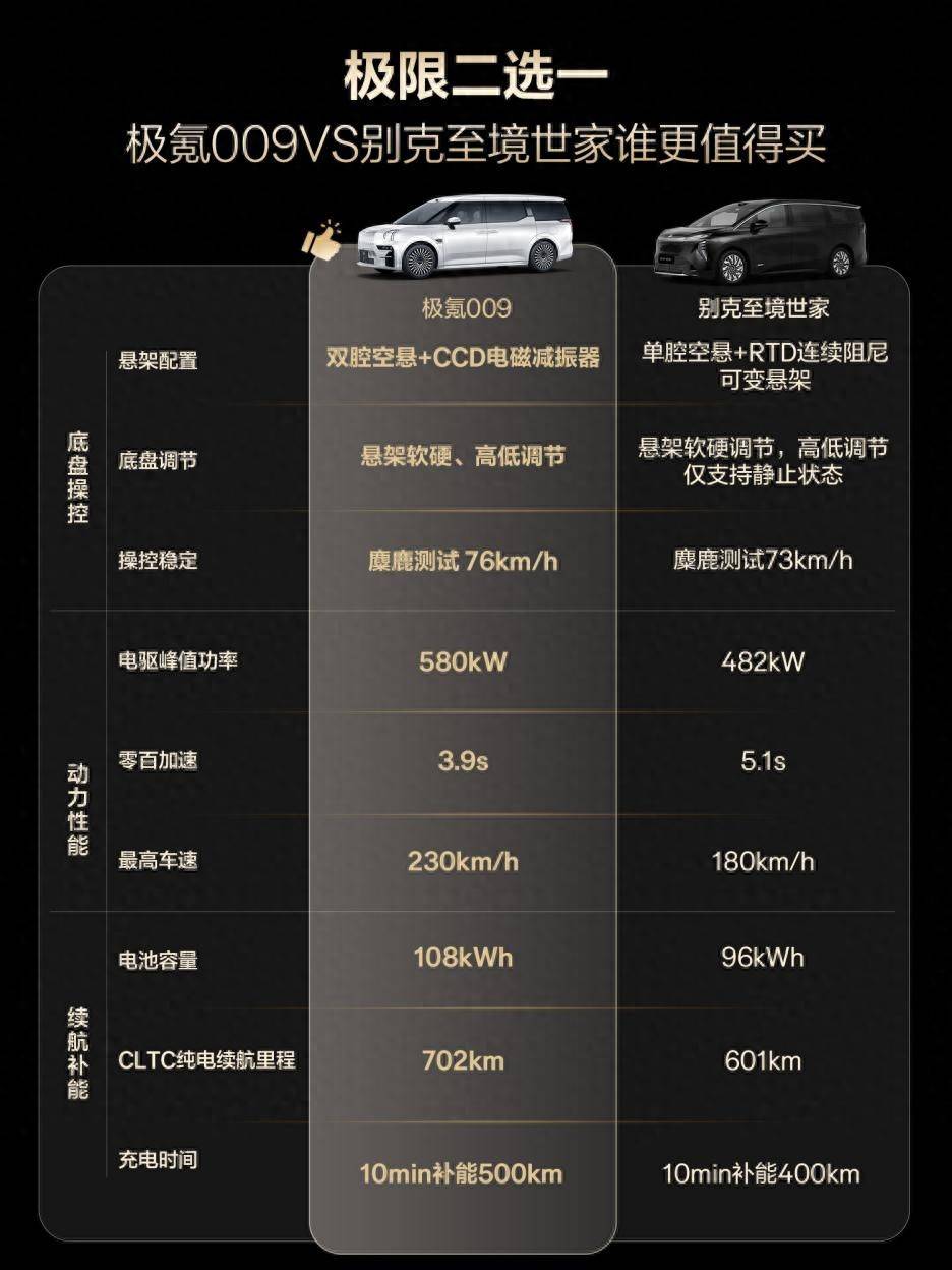 另外,在加速、电池容量、续航以及补能表现上对比,极氪009也略占上风,别克至境世家胜在品牌底子硬。