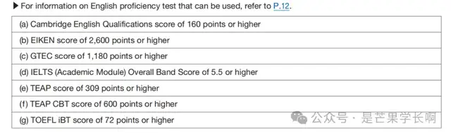 托福72及以上、雅思5.5及以上、剑桥英语160及以上等