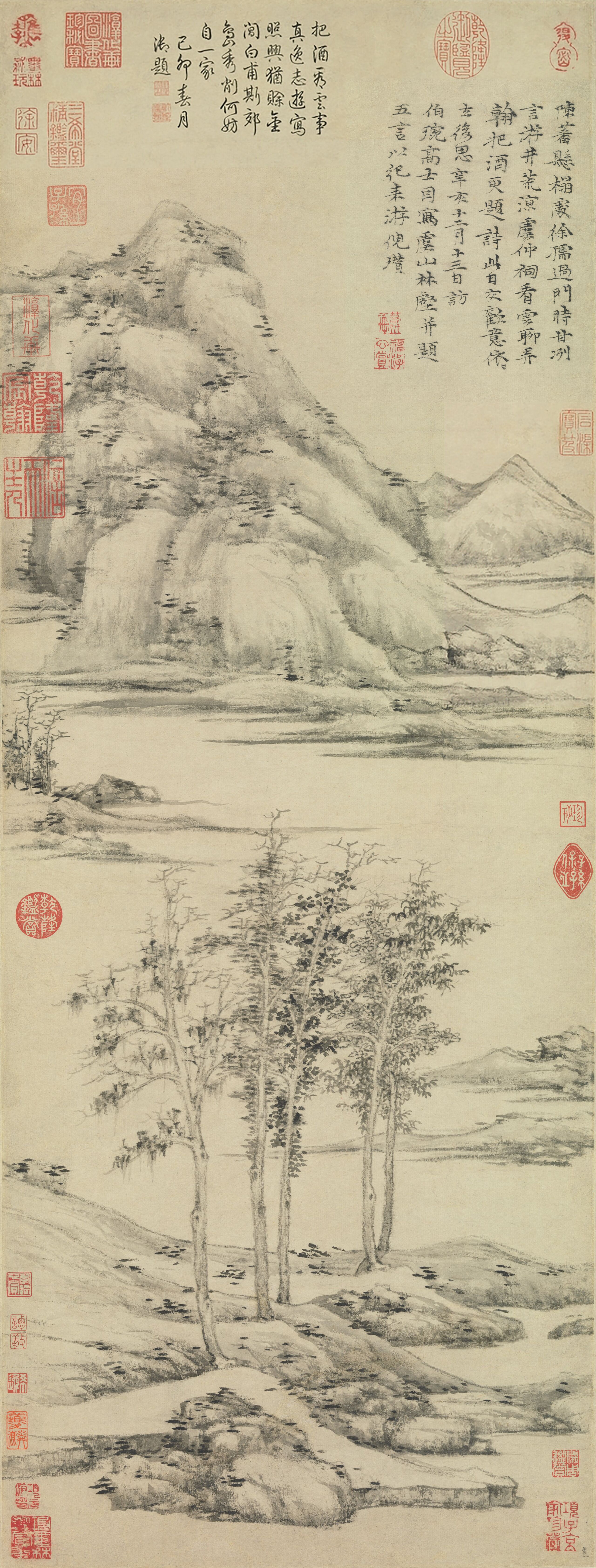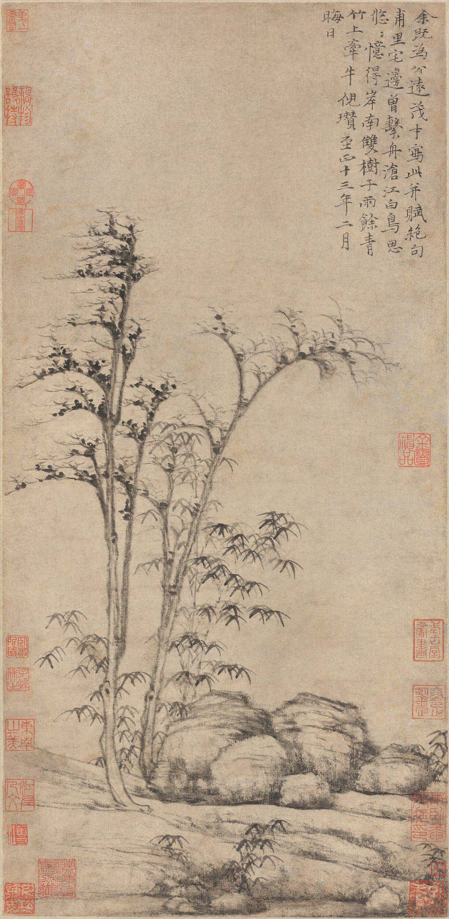 倪瓒擅长山水、墨竹,师法董源、荆浩、关仝、李成,并受到赵孟頫的影响。他的山水画构图平远,景物极简,多作疏林坡岸,浅水遥岑。其独特的技法“折带皴”,用笔变中锋为侧锋,形成了荒疏萧条、意境幽淡的风格。他的墨竹偃仰有姿,寥寥数笔,逸气横生。