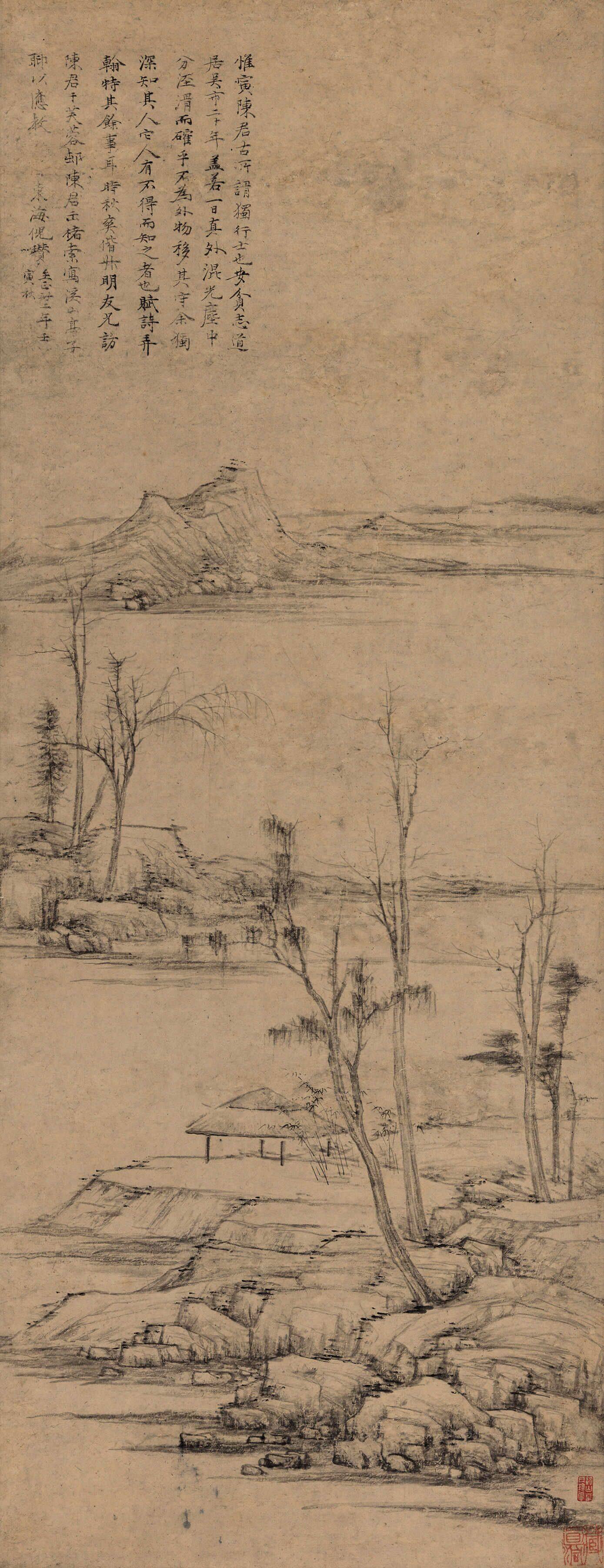 与黄公望、王蒙、吴镇并称为“元四家”,倪瓒的存世作品包括《渔庄秋霁图》、《六君子图》、《容膝斋图》等。他的画作以纸本水墨为主,画风疏简,格调天真幽淡,多描绘太湖一带的山水,构图平远,景物极简,用笔干练,意境荒寒空寂,风格萧散超逸。