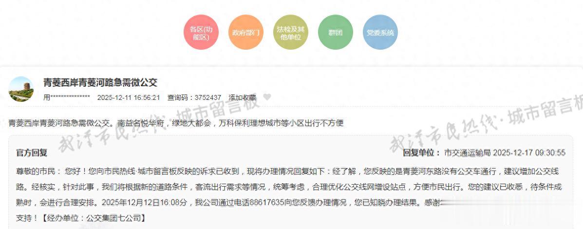 官方回复:经了解,您反映的是青菱河东路没有公交车通行,建议增加公交线路。经核实,针对此事,我们将根据新的道路条件,客流出行需求等情况,统筹考虑,合理优化公交线网增设站点,方便市民出行。您的建议已收悉,待条件成熟时,会进行合理安排。
