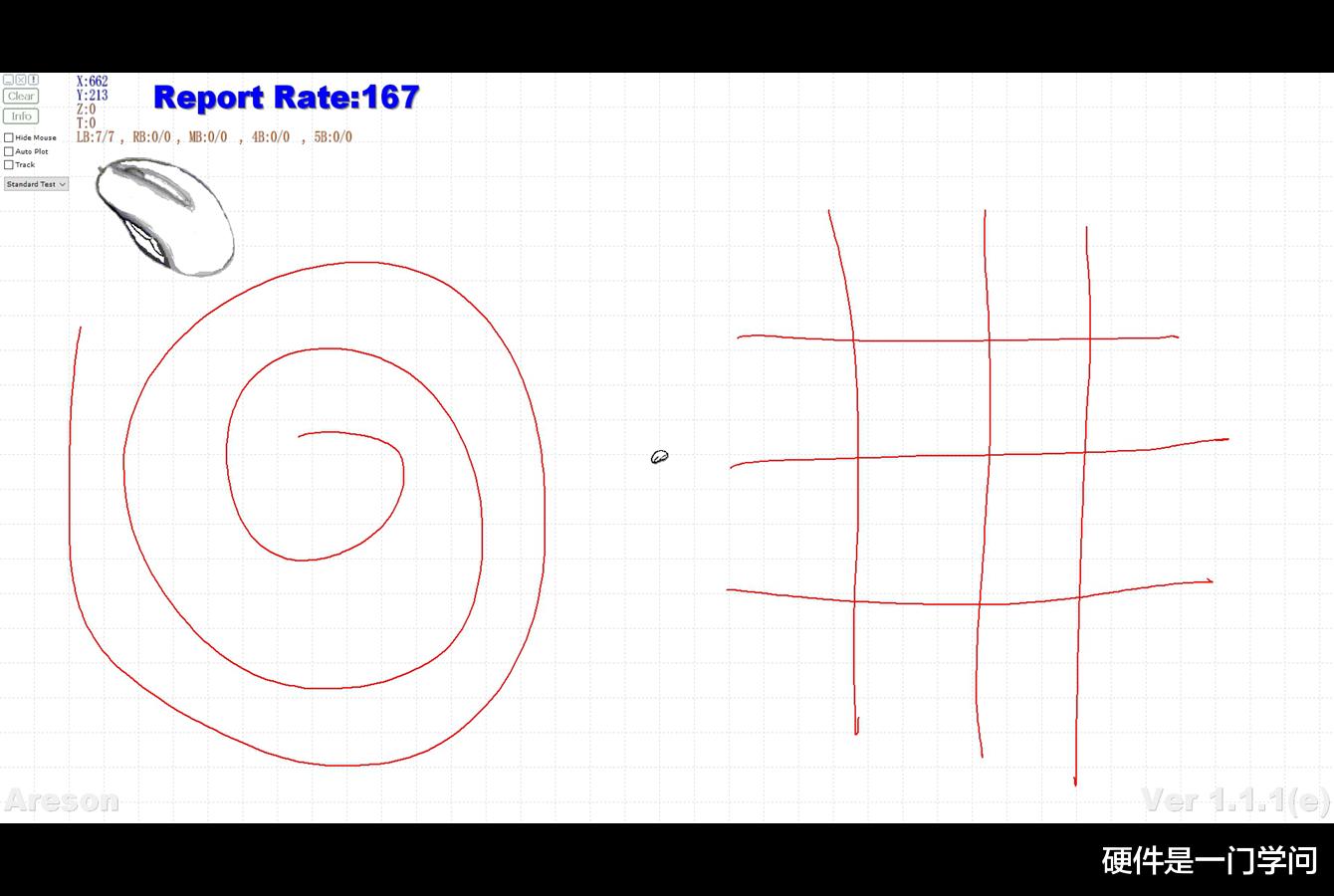通过MouseTest软件简单测试一下蚊香图和井字,将DPI设置为1600,驱动里关闭直线修正,蚊香图线条流畅、连贯,锯齿感不强,井字横线和竖线直线修正不明显。