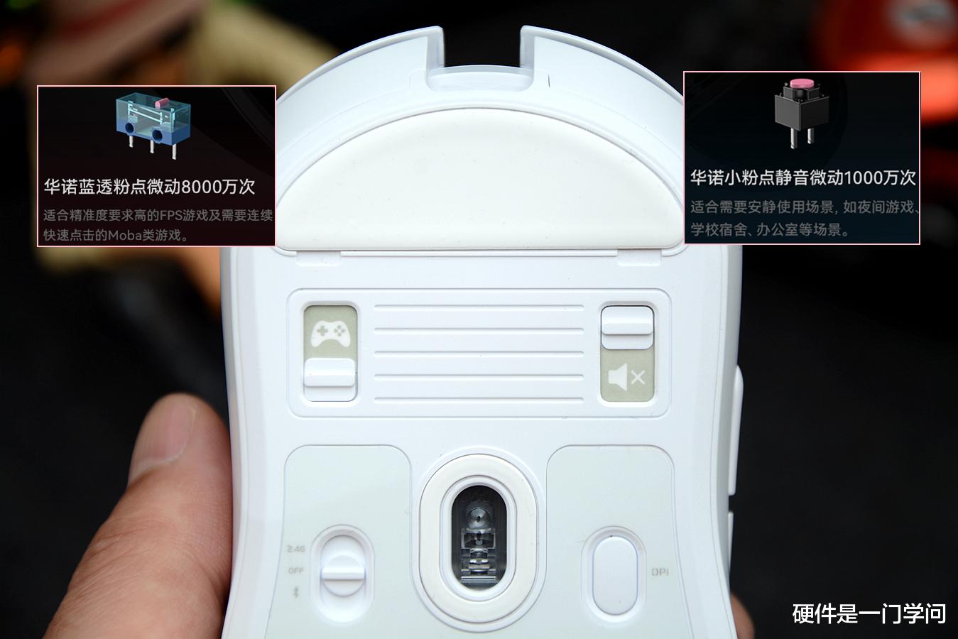 上部为双微动切换开关,显示手柄图案代表为游戏模式,小喇叭图案代表静音模式。游戏模式采用华诺蓝透粉点微动,8000万次设计寿命,声音清脆,回弹较强,适合玩电竞游戏。静音模式采用华诺小粉点静音微动,1000万次设计寿命,几乎听不到声音,回弹较弱,适合办公或多人宿舍使用。