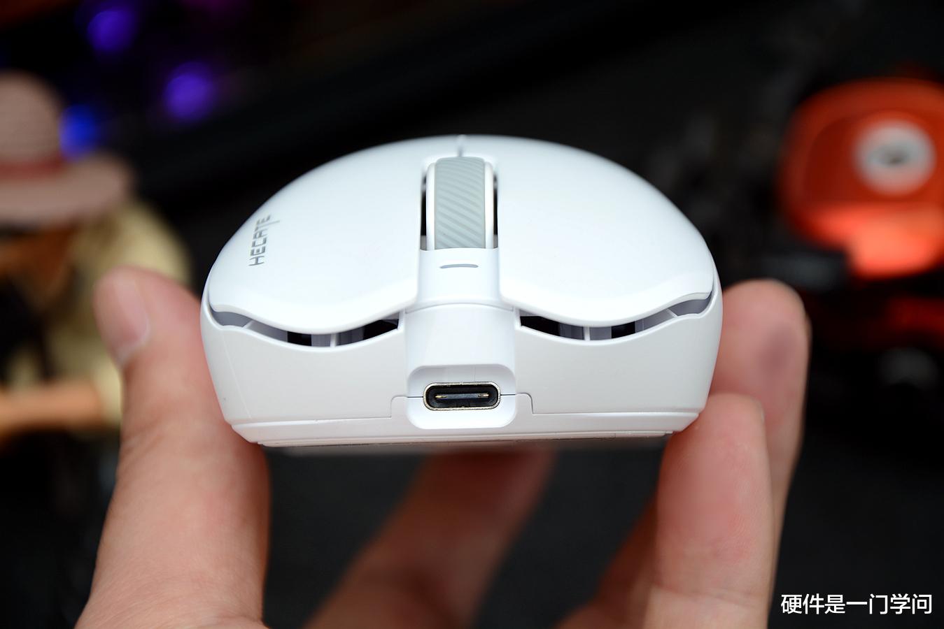 指示灯后方是滚轮,表面位橡胶材质,带有防滑纹理,比上代更细腻,刻度感清晰,声音很小,点击声音清脆。前部为USB-C接口,接口布局较浅。