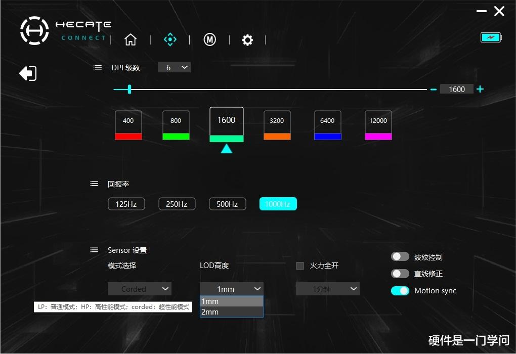 参数设置,默认400、800、1600、3200、6400、12000六档DPI值,升级版依然采用PMW3395引擎,650IPS,50G加速度,通过软件设置超频,最大可以拉到32000DPI。回报率有125Hz、250Hz、500Hz、1000Hz四档,默认1000Hz。传感器设置,模式选择有LP常规模式、HP高性能模式、Corded超性能模式,有线模式为Corded模式,2.4G有LP和HP两种模式可选。LOD高度有1mm和2mm两种高度可选,火力全开可以设置1-15分钟,同时也可以对波纹控制、直线修正、圆滑修正算法进行设置。