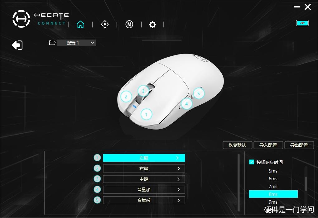 分体式左右按键,按键内凹设计,顶部进行了切边处理。与上代不同,升级版两个按键缝隙中间布局了一枚指示灯,低电量时红灯闪烁,充电时红灯常亮,充满后绿灯常亮,同时也是DPI指示灯,不同颜色代表设置的不同DPI值。