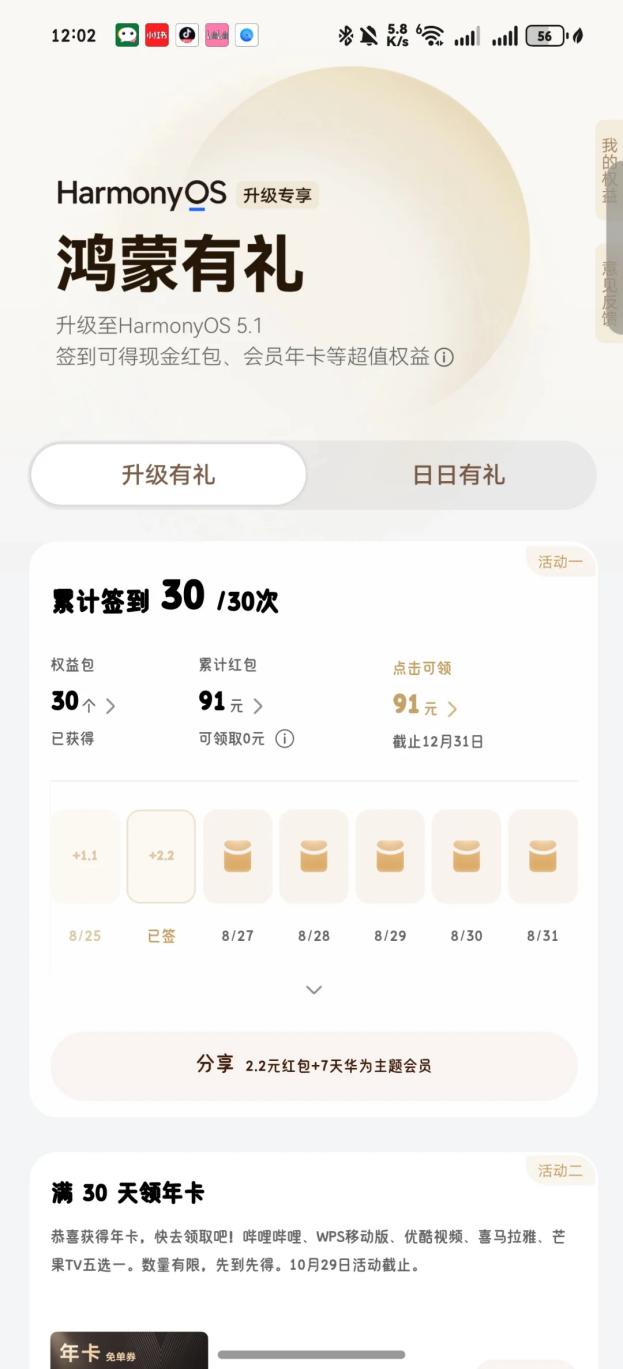 突然想起前阵子网上冲浪,刷到升级“鸿蒙有礼”免费开会员的活动贴子,这不刚好合适。仔细研究了下,当下给我的华为手机升级到HarmonyOS 5.1的,手机桌面右滑至负一屏点击“鸿蒙有礼”参与活动,每天签到领现金、还能领热门应用月卡兑换券,我的快乐追剧小甜水——优酷,赫然在列!。