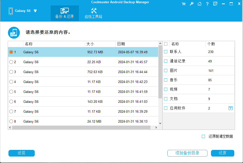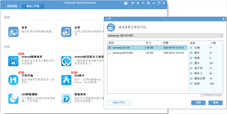 第 2 部分。如何通过 Coolmuster Android Assistant 备份和恢复 Android ? [选择性]Coolmuster Android Assistant 是一款用于管理 Android 设备的一体化解决方案。它允许您有选择地备份和恢复特定数据,例如联系人、消息、应用程序和媒体文件。当然,该软件还可以让您在电脑和手机之间传输数据,让您可以直接在电脑上管理手机数据,例如删除联系人 、回复短信、卸载应用程序等。您还可以通过该软件一键备份和恢复您的 Android 手机。对于想要更好地控制备份和恢复内容的用户来说,这是理想的选择。