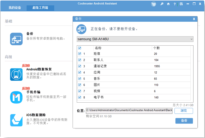 2.点击 “备份” 选项,选择要备份的内容,然后选择电脑上 Android 备份的存储位置;选择后,单击 “备份” 按钮将 Android 数据备份到您的 PC。