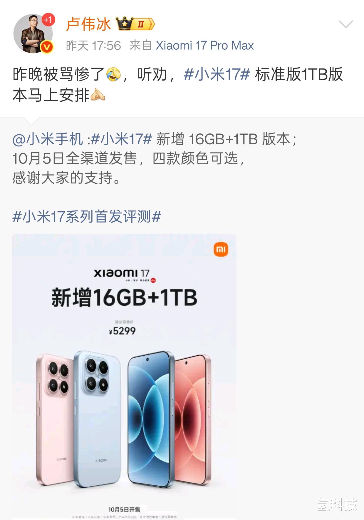 对了,言归正传,谈到吐槽这事儿,呼声最大的还是小米17这款手机的存储规格,发布会上,我们可以清晰的看到,这款手机的最大规格为16G+512G,当我看到这个也是挺蒙圈的,该不会丢了一个版本吧,1TB的呢?说实话,现在手机的照片和视频都比较大,这些大家应该深有感受,除了父母他们可能要求小一些,现在的年轻人,手机基本上也得512G起步了,更多的人会选择1TB的版本,这样省得来回折腾,很多存储低的小伙伴,通常都是一段时间后,把照片啊视频啊,倒腾到云盘或者硬盘,这样真的挺麻烦的。当然用户的呼声也是很大的,卢伟冰也很听劝,直接安排了1TB版本,不过目前还没有上架,要等等10月5日,不过大家也不在乎这几天了,再耐心等等吧。