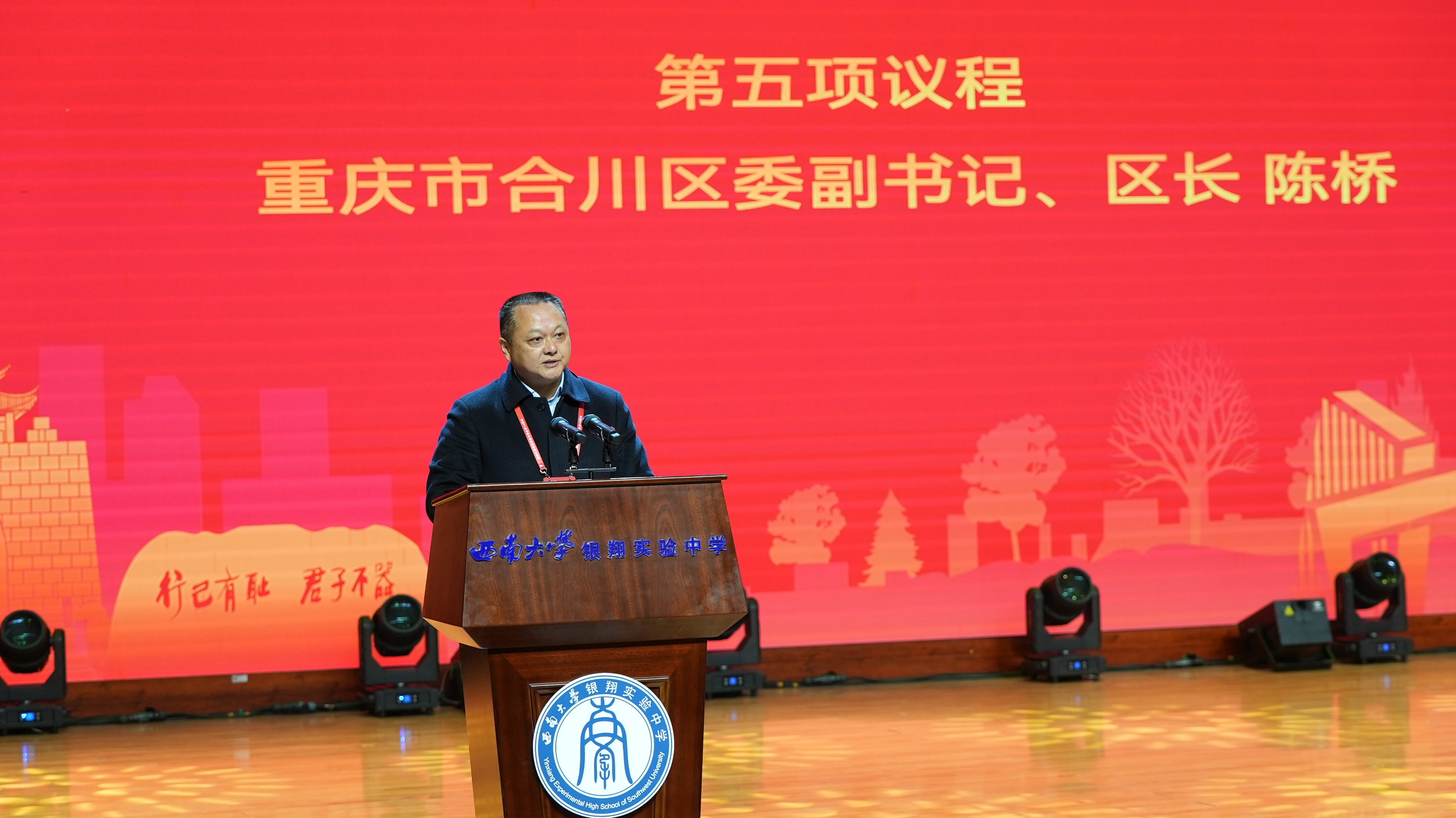 区委副书记、区长陈桥代表区委、区政府向学校十周年办学表示热烈祝贺。他指出,西南大学银翔实验中学为我区乃至重庆的基础教育高质量发展作出了积极贡献,已成为我区打造“中国教育人必访地”的闪亮名片。十年来,学校全面贯彻党的教育方针,深度融入重庆教育强市建设,从零起步、跨越发展,造就了一大批进入顶尖学府的英才,培养了一大批扎根基层、服务社会的栋梁,走出了一条“校地协同、科创引领、五育融合”的特色办学之路,成为全区教育改革的“试验田”“排头兵”。陈桥表示,区委、区政府将一如既往支持学校建设,希望学校守正创新、赓续前行,以高水平的教育教学质量,为全市、全区教育发展贡献更大力量,书写更加灿烂的时代华章!