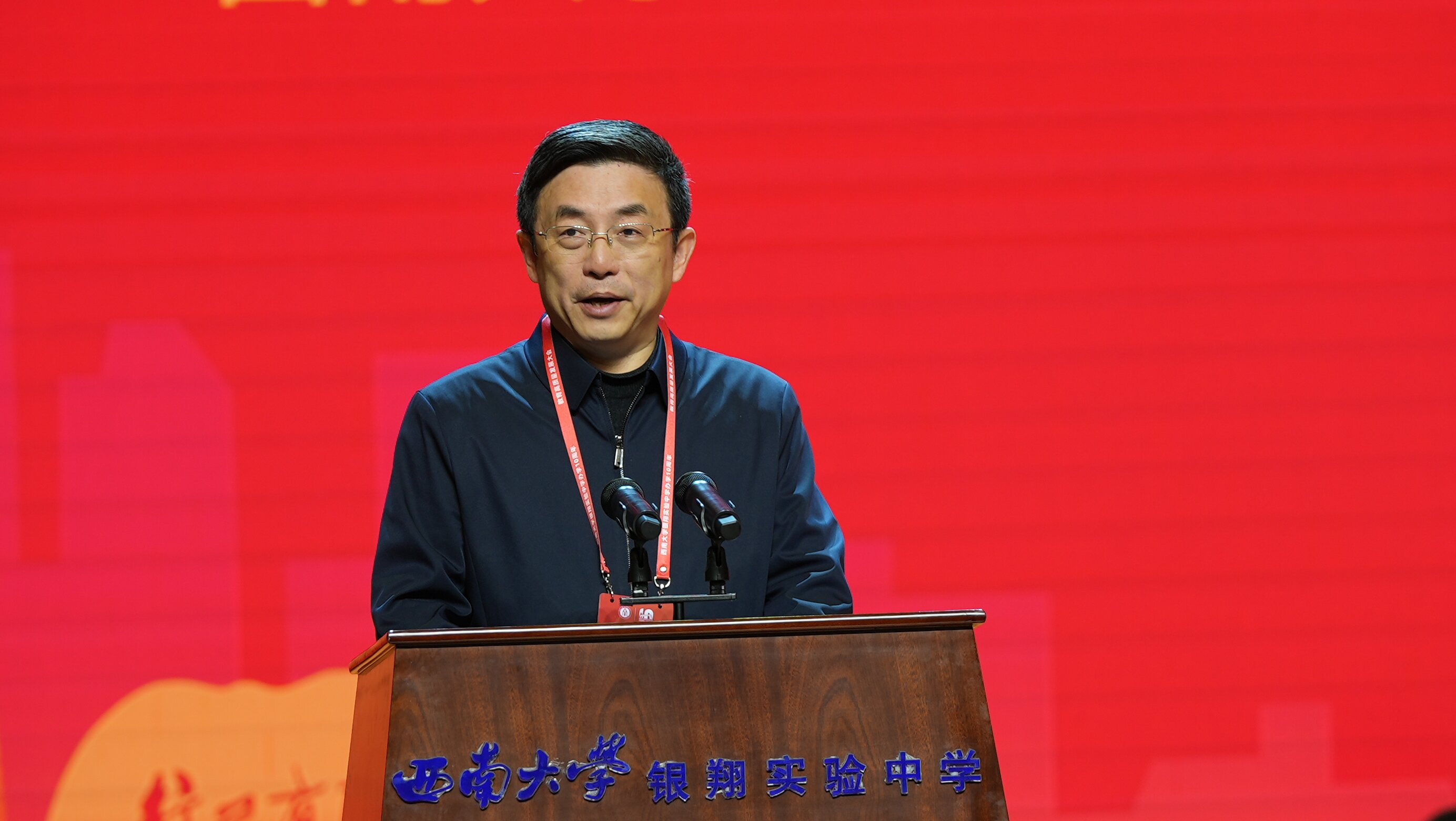 会上,西南大学党委书记张卫国在讲话中深情讲述了西南大学对附属中学集团学校一以贯之的支持与期盼,他表示,作为西南大学附中的首所分校,银翔实验中学自诞生起,便秉承西南大学“含弘光大、继往开来”的精神基因,更将附属中学“行己有耻、君子不器”的校训融入发展血脉。十年来,在附属中学的引领带动下,银翔实验中学始终坚守初心、勇担使命,实现了从初创到蓬勃发展的跨越——教学成绩持续进步,特色品牌日益彰显,不仅成为合川基础教育标杆,更在重庆乃至西南地区赢得了广泛声誉。张卫国强调,西南大学将持续深化与合川区的校地战略合作,汇聚更多优质资源,为西大银翔迈向更高水平提供坚实支撑。