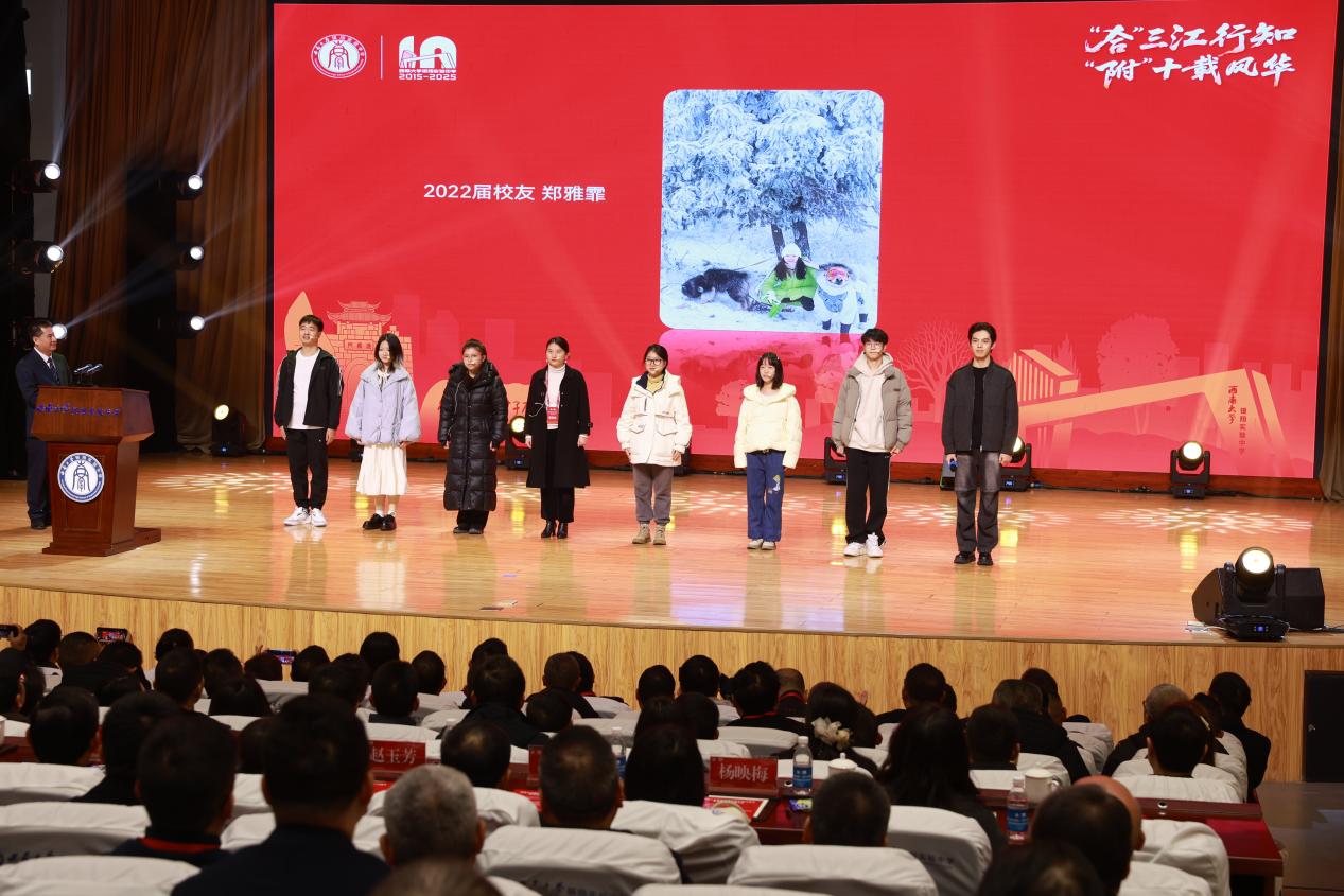 在校友祝福环节,从2018届到2025届的八位校友代表依次登台,齐声祝愿母校生日快乐。校友代表向母校敬献礼物,表达对母校培育之恩的感激与对母校未来发展的美好祝愿,将现场气氛推向高潮。