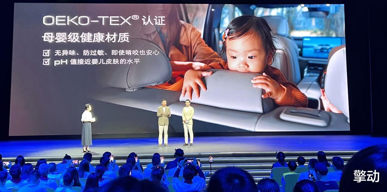 比如座椅,至境E7全系标配的座椅面料甄选OEKO-TEX®母婴级健康认证材质,即使小孩拿嘴去啃也安然无忧。别克还拿到一个中汽中心发的“零甲醛”的认证,新车那种刺鼻的味道,在这辆车里是闻不到的。