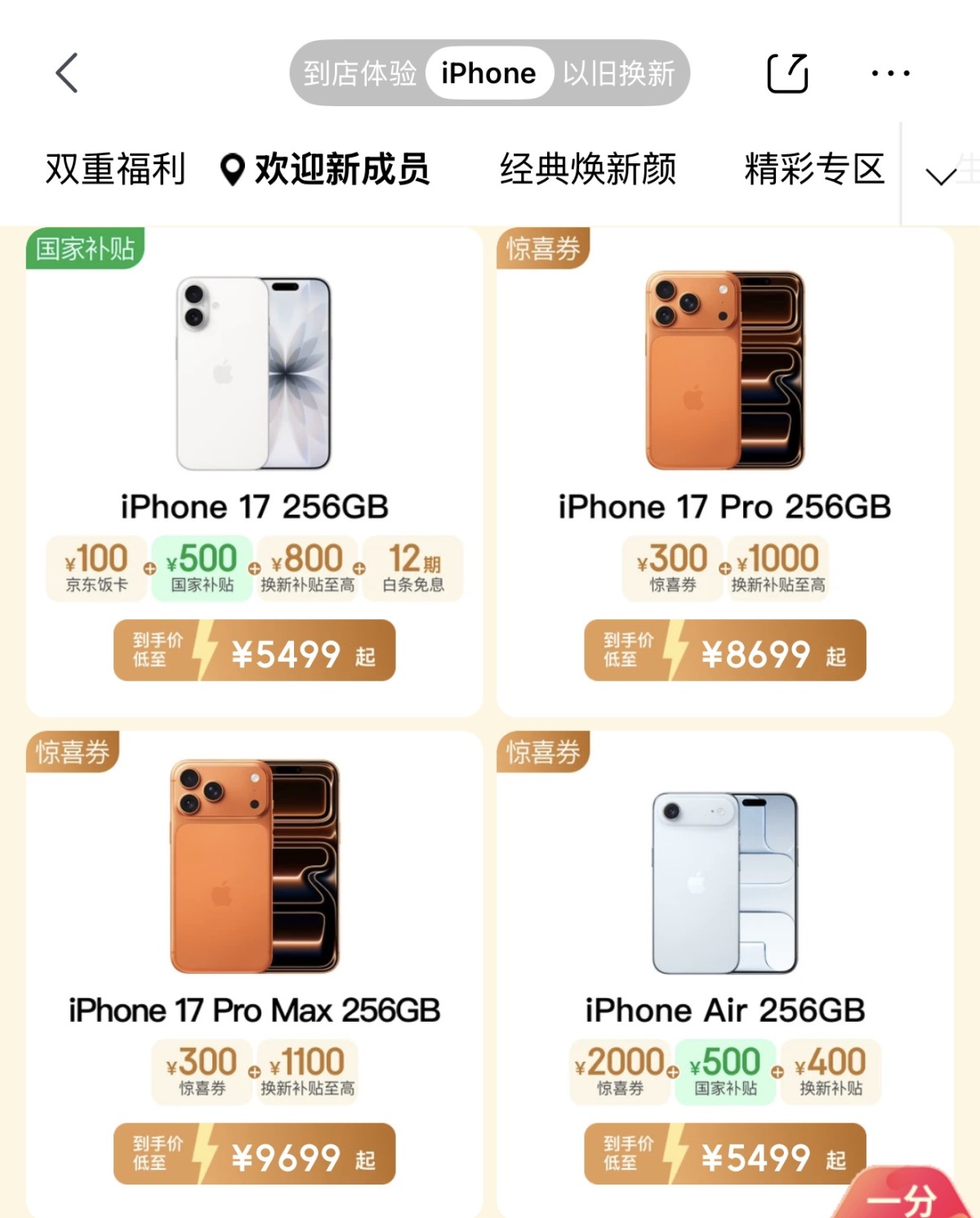 苹果今年高端iPhone的价格防线崩溃得比预期更彻底。先是iPhone Air经历“史诗级跳水”,让首发用户感到被“背刺”。紧接着,老款高端旗舰iPhone 16 Pro也坐不住了,在电商平台叠加国家补贴后,价格跌至历史新低。