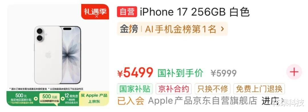 在同样有国补资格的情况下,iPhone 17 标准版 256GB 版本 5499 元可以拿下,甚至在部分第三方平台的百亿补贴,不需要国补资格在不砍单的情况下 5099 也能到手。