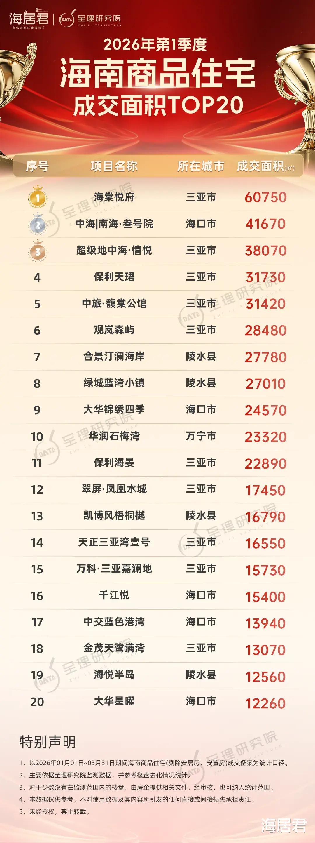成交面积方面,海口中海·南海叁号院成交约4.2万方夺亚军;三亚超级地中海·憘悦成交约3.8万方拿下季军;三亚保利天珺成交约3.2万方排名第四;三亚中旅馥棠公馆成交约3.1万方位列第五。