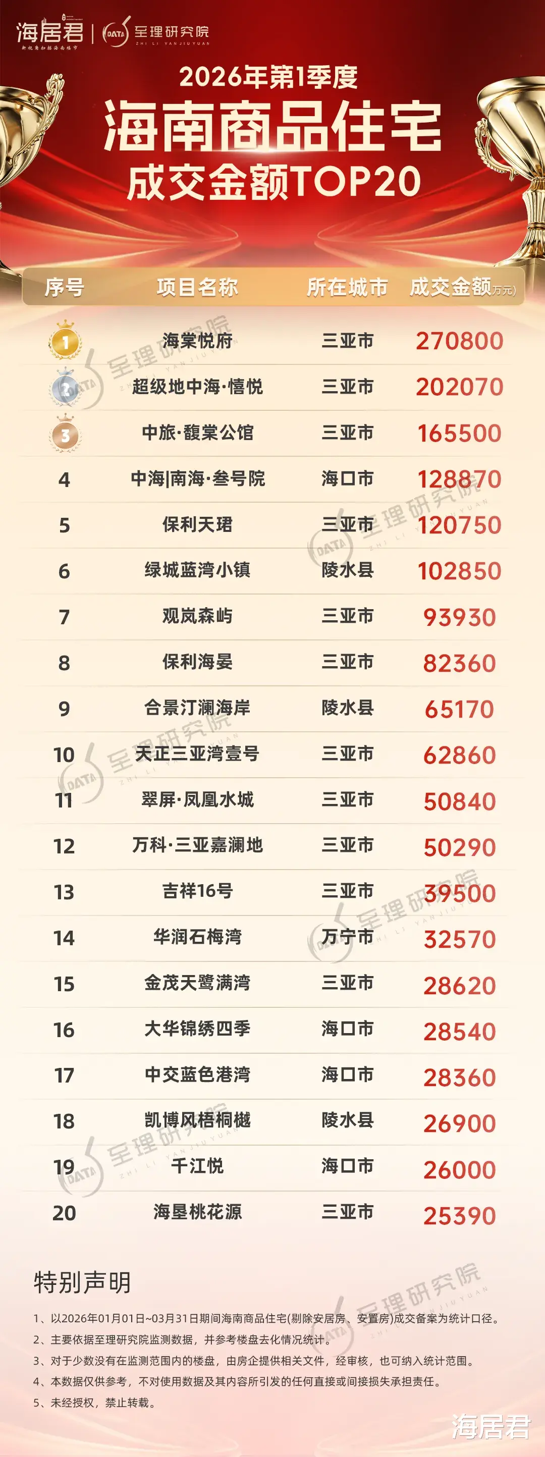 成交金额方面,三亚超级地中海·憘悦揽金约20.2亿元摘亚军;三亚中旅馥棠公馆揽金约16.6亿元夺季军;海口中海·南海叁号院揽金约12.9亿元居第四;三亚保利天珺揽金约12.1亿元排名第五。