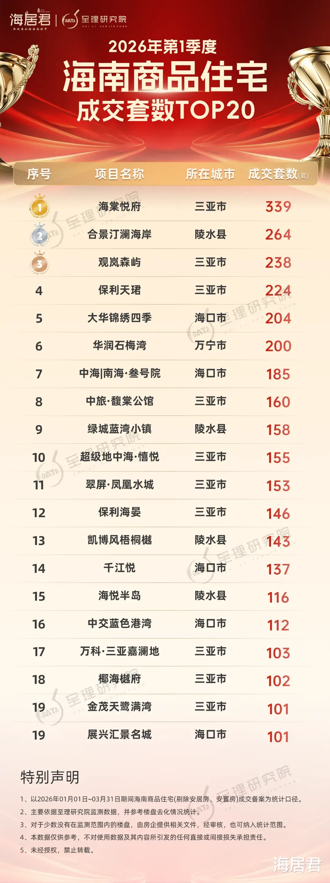 三亚海棠悦府成交339套、成交面积约60750平方米,揽金27.08亿元,一举夺得第1季度海南商品住宅成交套数、成交面积、成交金额三大榜单冠军,是今年第1季度海南卖得最好的商品住宅楼盘。
