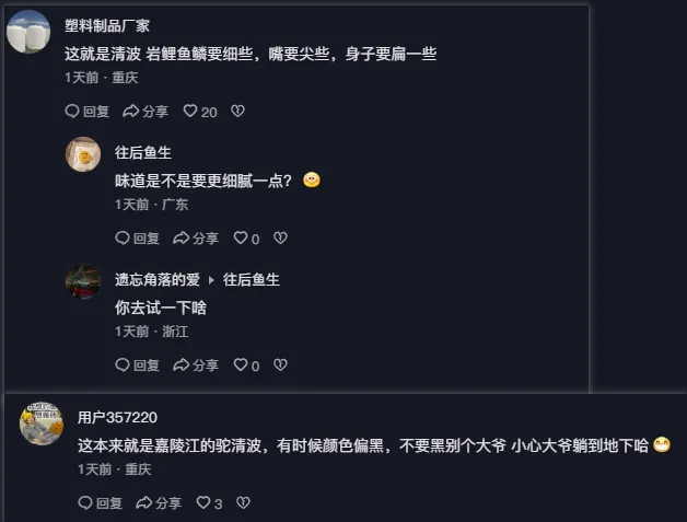 另外在重庆的网友也表示:这就是清波,岩鲤鱼鳞要细些,嘴要尖些,身子要扁一些!,也有重庆网友说道:这本来就是嘉陵江的驼清波,有时候颜色偏黑,不要吓别个大爷,小心大爷躺到地下哈!