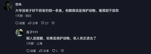 于是就有一位四川网友说道:“大爷说:老子好不容易钓到一条鱼,你跟我说是保护动物,看我怼不怼你!”