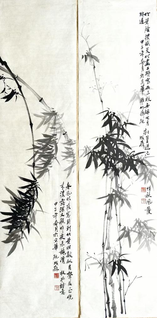 在阮成森的艺术世界里,“竹” 是当之无愧的核心符号,也是他精神追求的具象表达。他曾坦言 “酷爱兰竹,继承传统集诸家之长,补己所短”,这份 “爱” 并非浅尝辄止的兴趣,而是深入骨髓的坚守 —— 他 “种竹写竹,赏竹咏竹、迷竹、恋竹”,将竹从 “创作题材” 升华为 “人生知己”。在他的笔下,竹不再是单纯的自然物象,而是承载着人格理想的精神载体:他以传统笔墨勾勒竹的挺拔身姿,用中锋行笔表现竹的坚韧风骨,又以现代构图赋予竹新的视觉张力,让每一幅竹画都兼具 “古意” 与 “新意”。无论是风雨中的竹之劲节,还是晨光里的竹之清雅,都能让人感受到他借竹传递的 “高风亮节”—— 那是不媚俗、不妥协的艺术态度,也是不浮躁、不功利的人生追求。