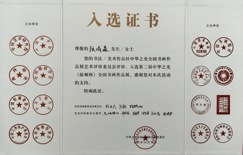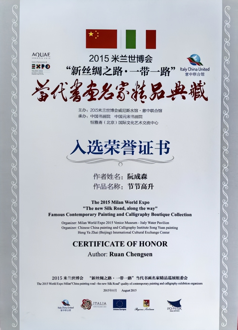 如今,阮成森身兼 CCTV 央视书画频道签约艺术家、中国美术家交流协会副主席、文化部中国山水画创作院院士等多重重要身份,更被外交部礼宾司授予 “国宾礼画家” 称号 —— 这一荣誉不仅是对其艺术水准的最高认可,更意味着他的作品已成为传递中国文化魅力的 “国家名片”。此外,北京汇融首博艺术品鉴定中心文物艺术品鉴赏师、美术评论家的身份,又让他在创作之外多了一份 “观察者” 的清醒:他既能以创作者的热情投入笔墨,又能以鉴赏家的眼光审视作品,这种双重视角,使得他的艺术创作始终保持着对 “品质” 与 “格调” 的敬畏,也让他对书画艺术的理解更为立体、深刻。