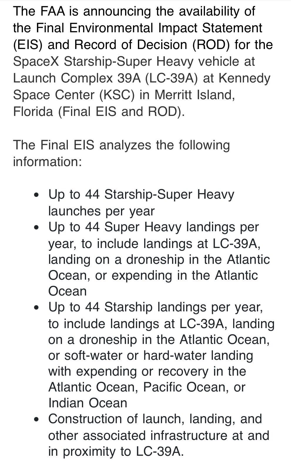 根据FAA发布的最终环境影响声明,肯尼迪航天中心39A发射台,每年可合法发射星舰44发,同时允许开展88次着陆作业(含44次超级重型助推器着陆、44次星舰上升级着陆),这一配额也是此次146发总量的重要组成部分。