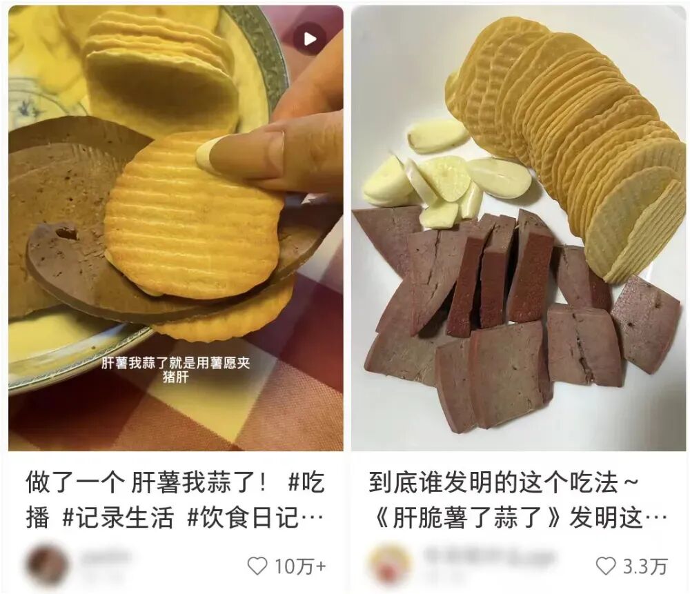 奶皮子糖葫芦是一个,固体杨枝甘露是一个,还有前段时间同样刷屏全网的“干脆薯了蒜了”也是一个,猪肝+薯片+蒜片叠吃,直接打开了吃货思路。