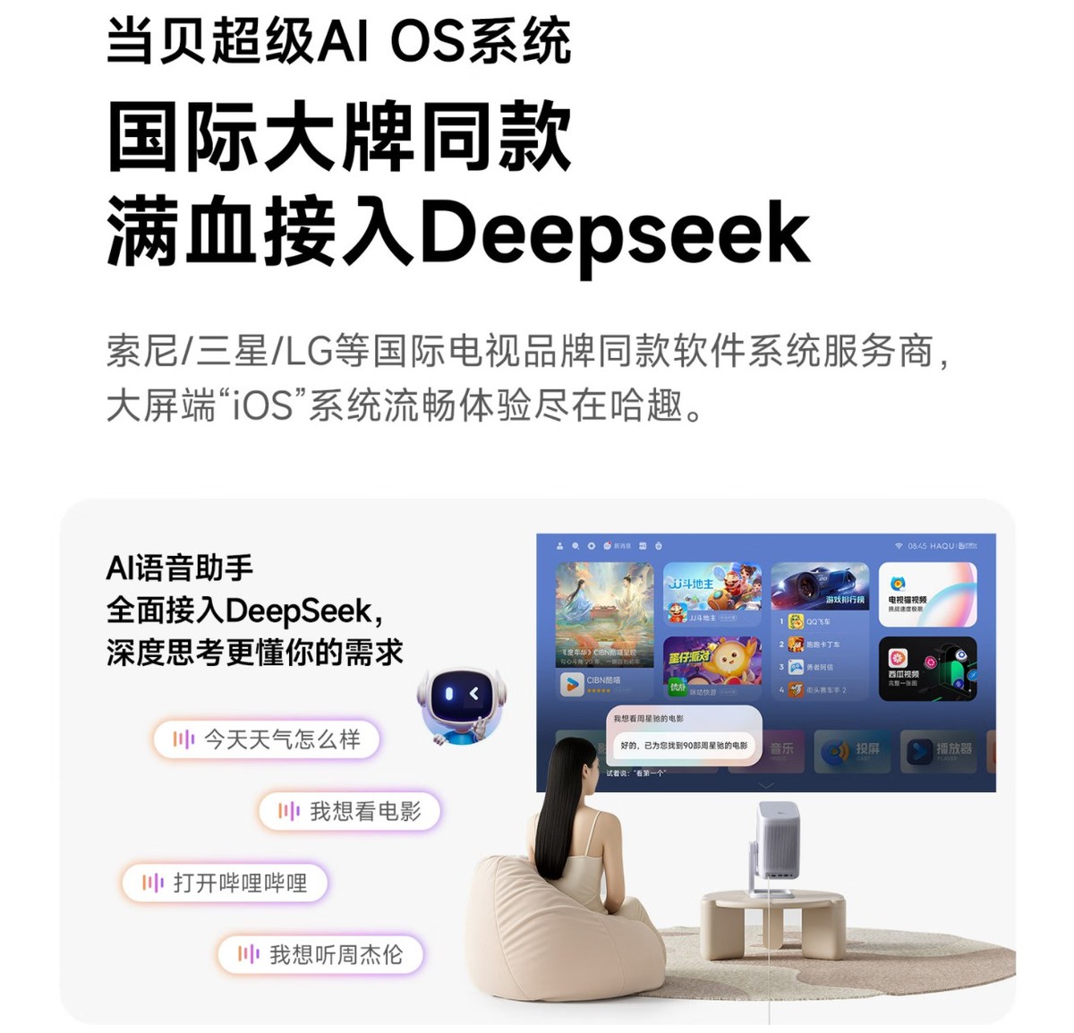 智能交互方面,DeepSeek语音交互让你通过语音就能轻松控制;自研AI感知技术包含了:自动梯形校正、自动对焦、自动智能避障、自动入幕实现0门槛使用。在游戏模式下,低延迟的表现连接Switch等游戏主机也不会卡顿。